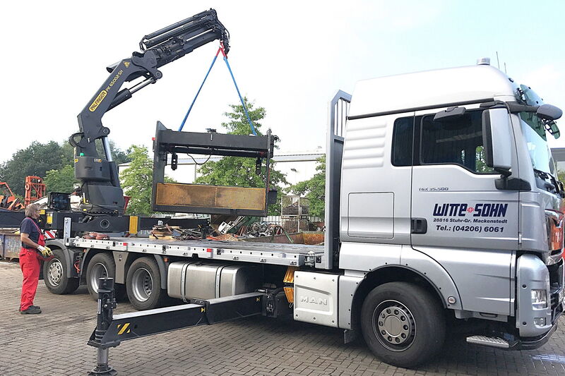 - Unser 2023 angeschaffter 4-Achs-Kranwagen ist hinterm Fahrerhaus montiert und hebt bis zu 12 Tonnen, bei 20m Auslage bis zu 3,1 Tonnen
